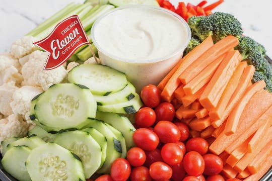 Seasonal vegetables, subject to availability and Mother Nature. Francisco's ranch dressing in the center: celery, carrots, broccoli, cauliflower, cherry tomatoes, peppers.-