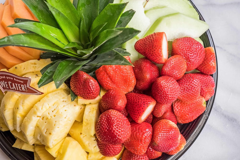 Seasonal Fruits subject to availability and Mother Nature. FLOWERING PINEAPPLE top in the center: honeydew, cantaloupe, watermelon, whole strawberries, pineapple.-